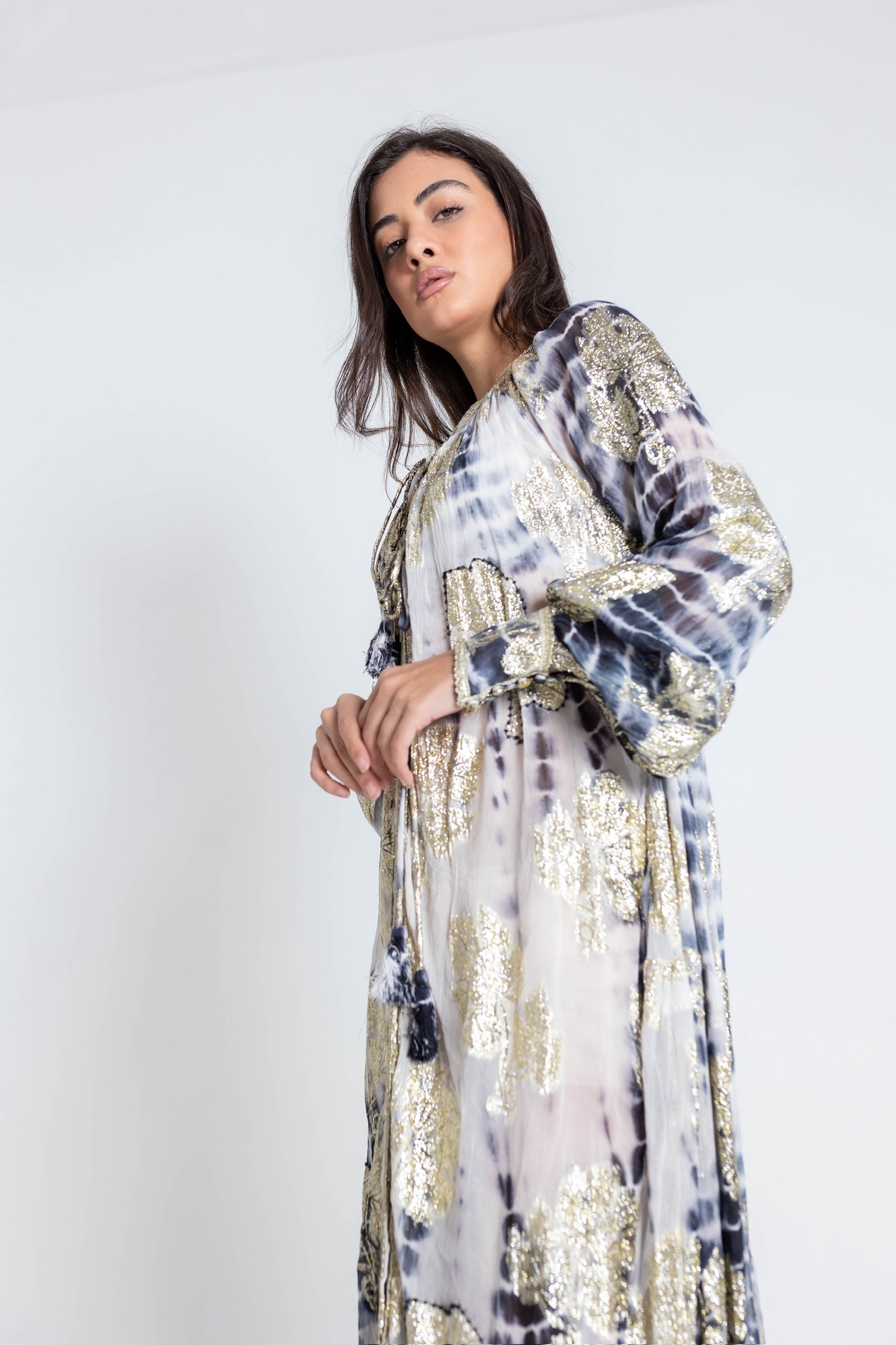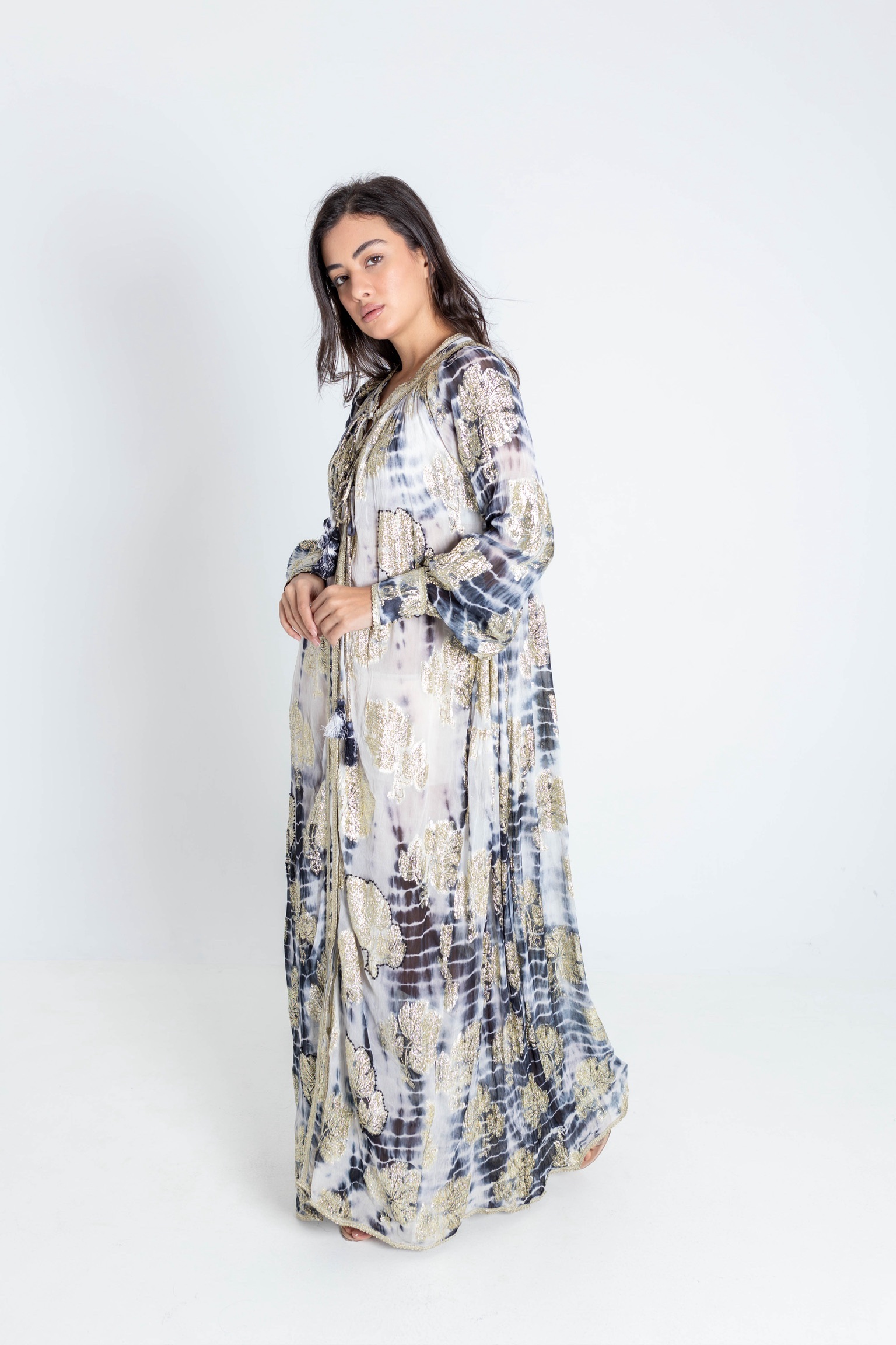 فستان شيفون مزري فاخر بتصميم انسيابي أنيق ولمسة فخمة تلفت الأنظار. يتميز بقماش شفاف بخفة عالية مع نقشة راقية ولمعات مزرية ناعمة تضيف إشراقة فاخرة للإطلالة. قصّة واسعة ومريحة مع فتحة رقبة أنثوية ورباط أمامي، وأكمام طويلة خفيفة تمنح حركة وانسيابية جميلة