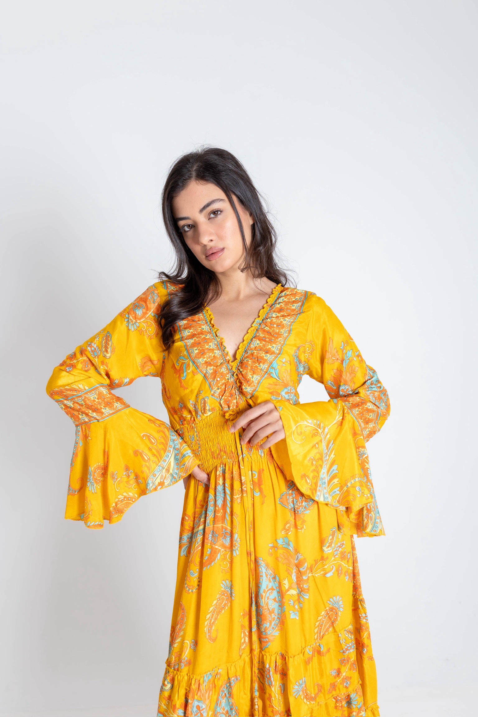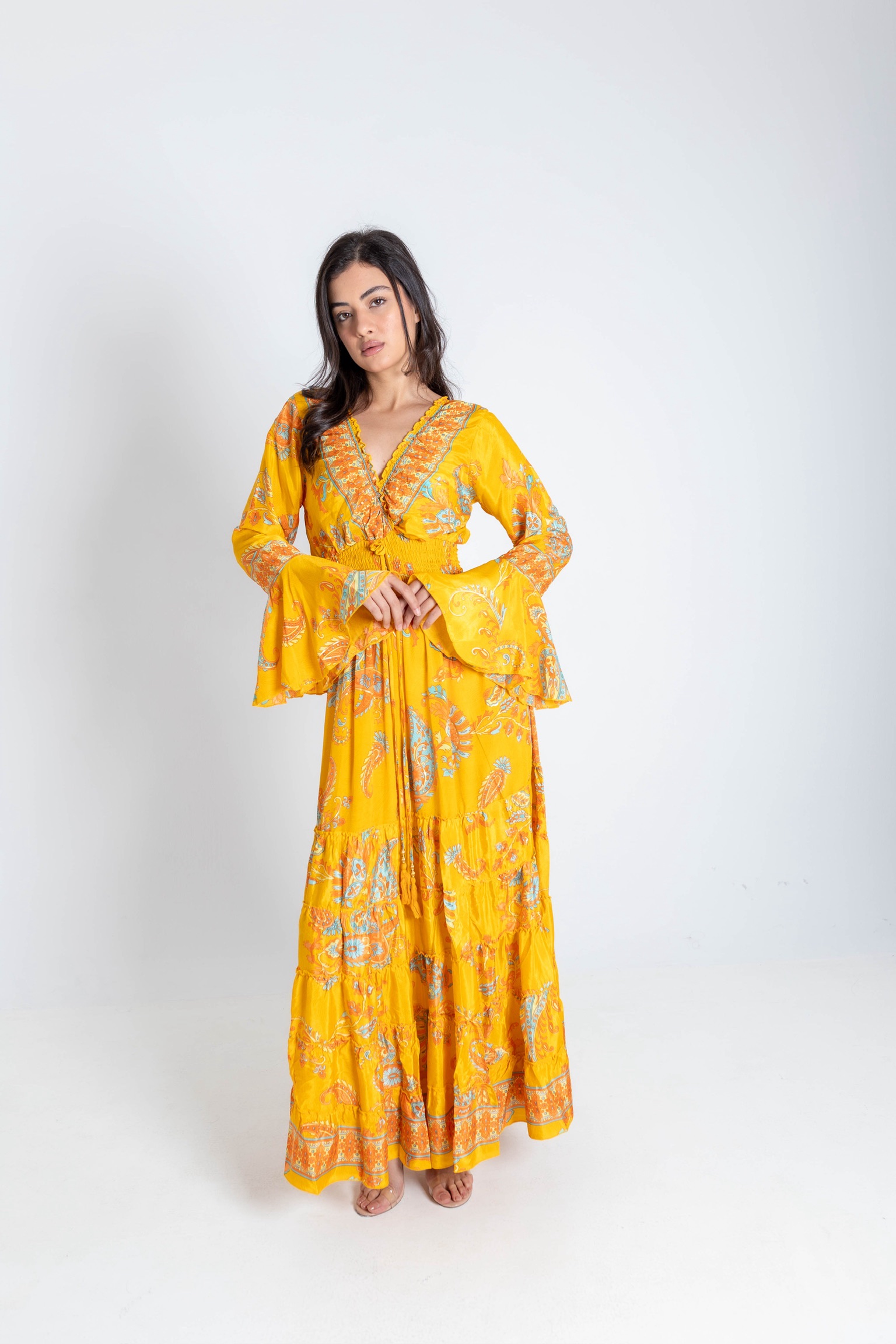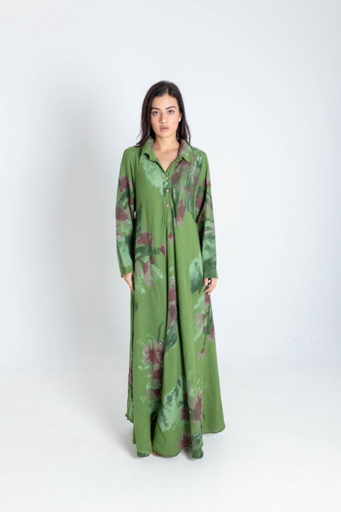 فستان من الحرير الإيطالي الفاخر بتصميم أنثوي أنيق ولمسة انسيابية راقية. يتميز بنقشة ناعمة وألوان مشرقة مع فتحة صدر جذابة وحزام مطاطي عند الخصر يبرز القوام بشكل جميل