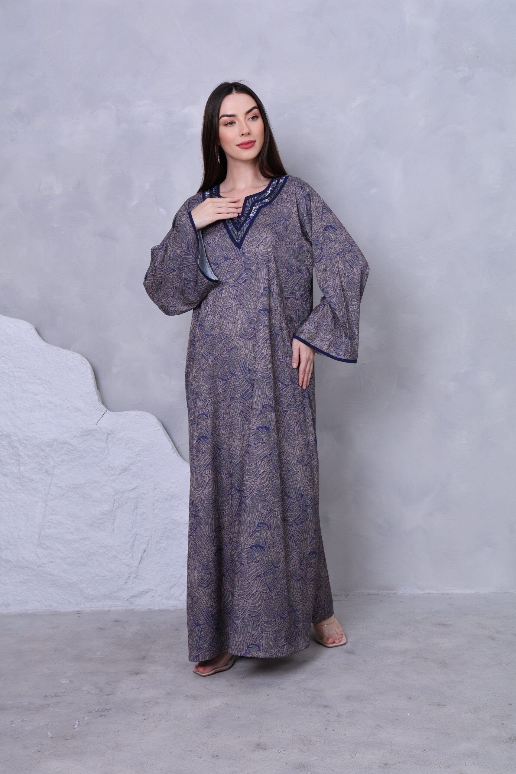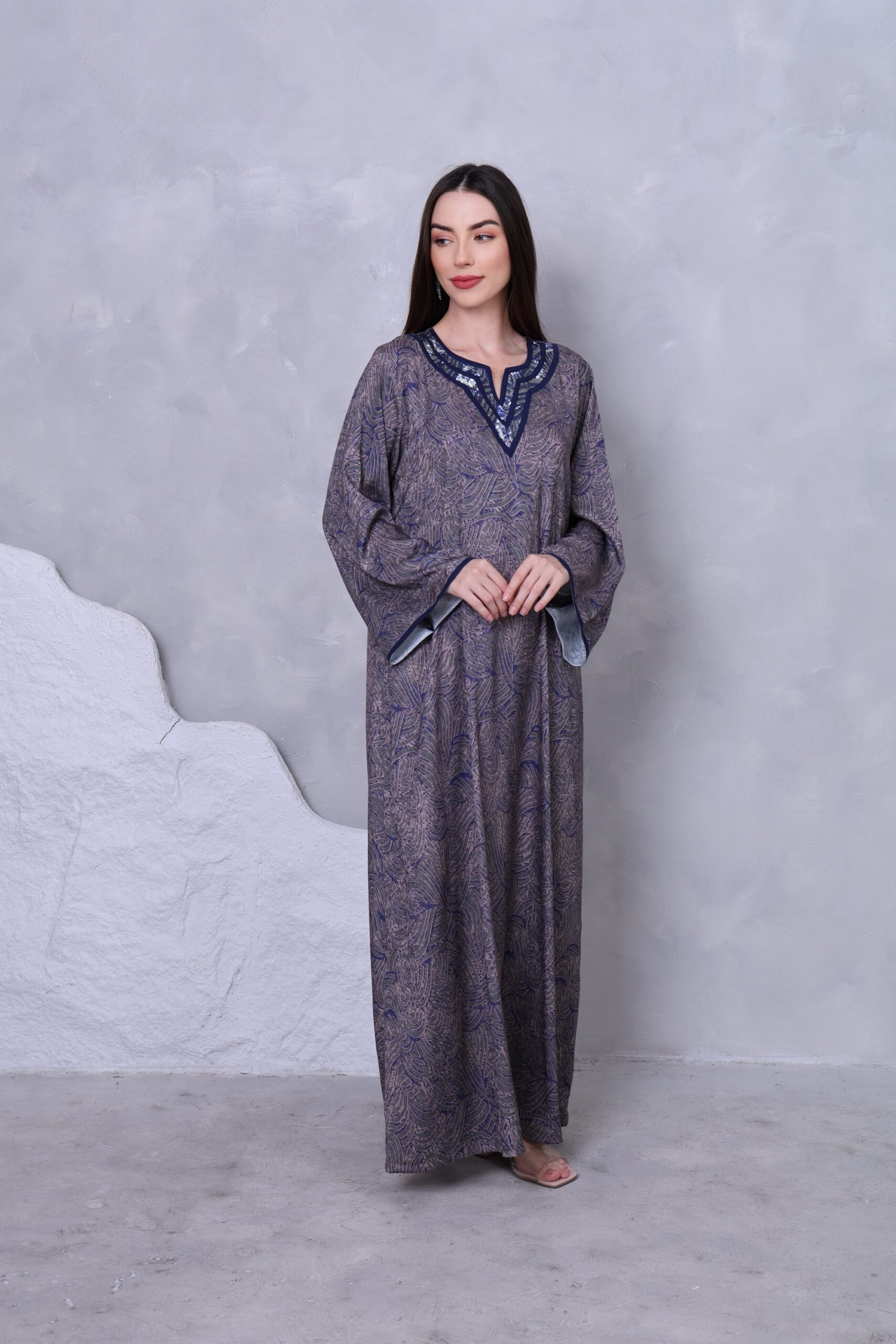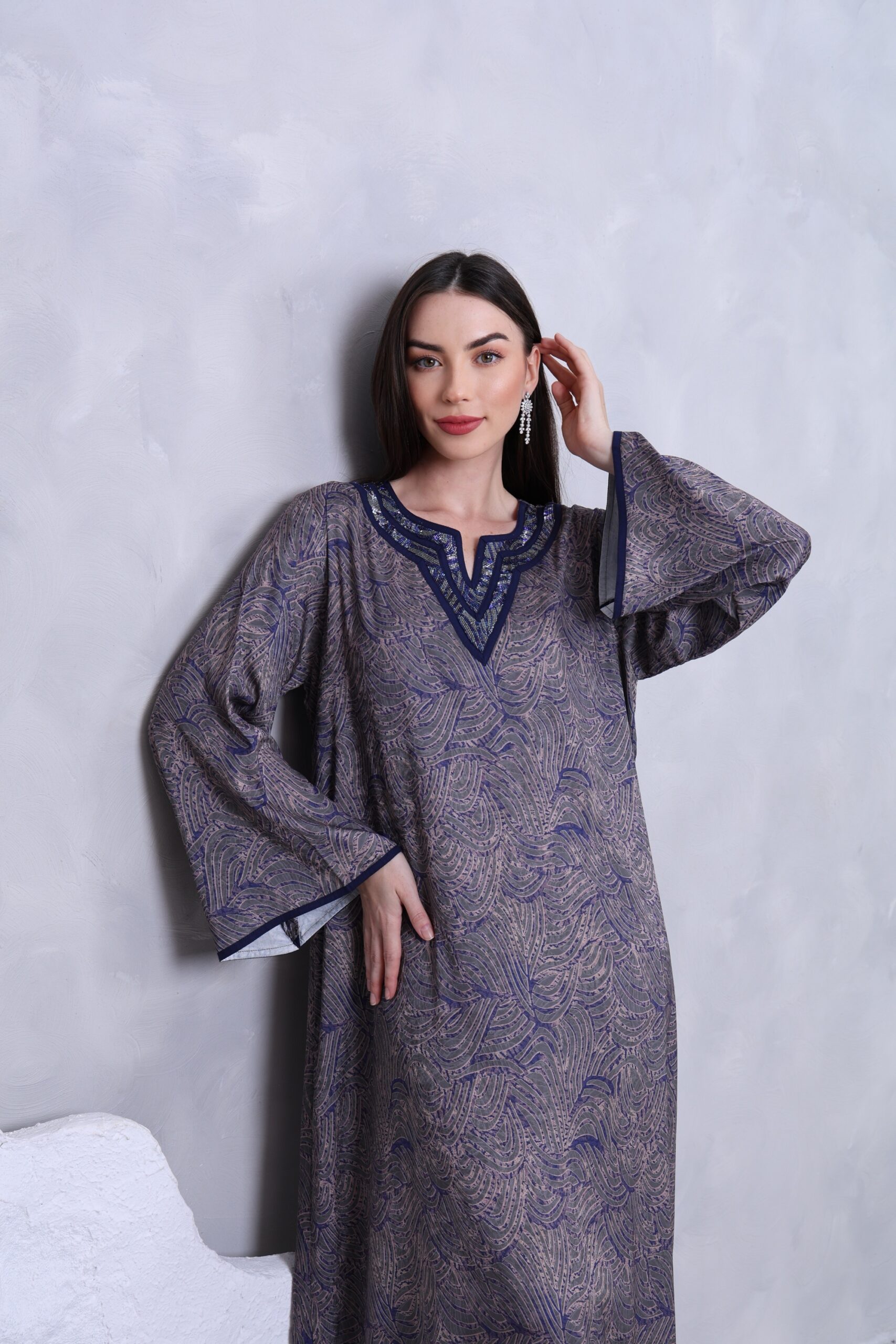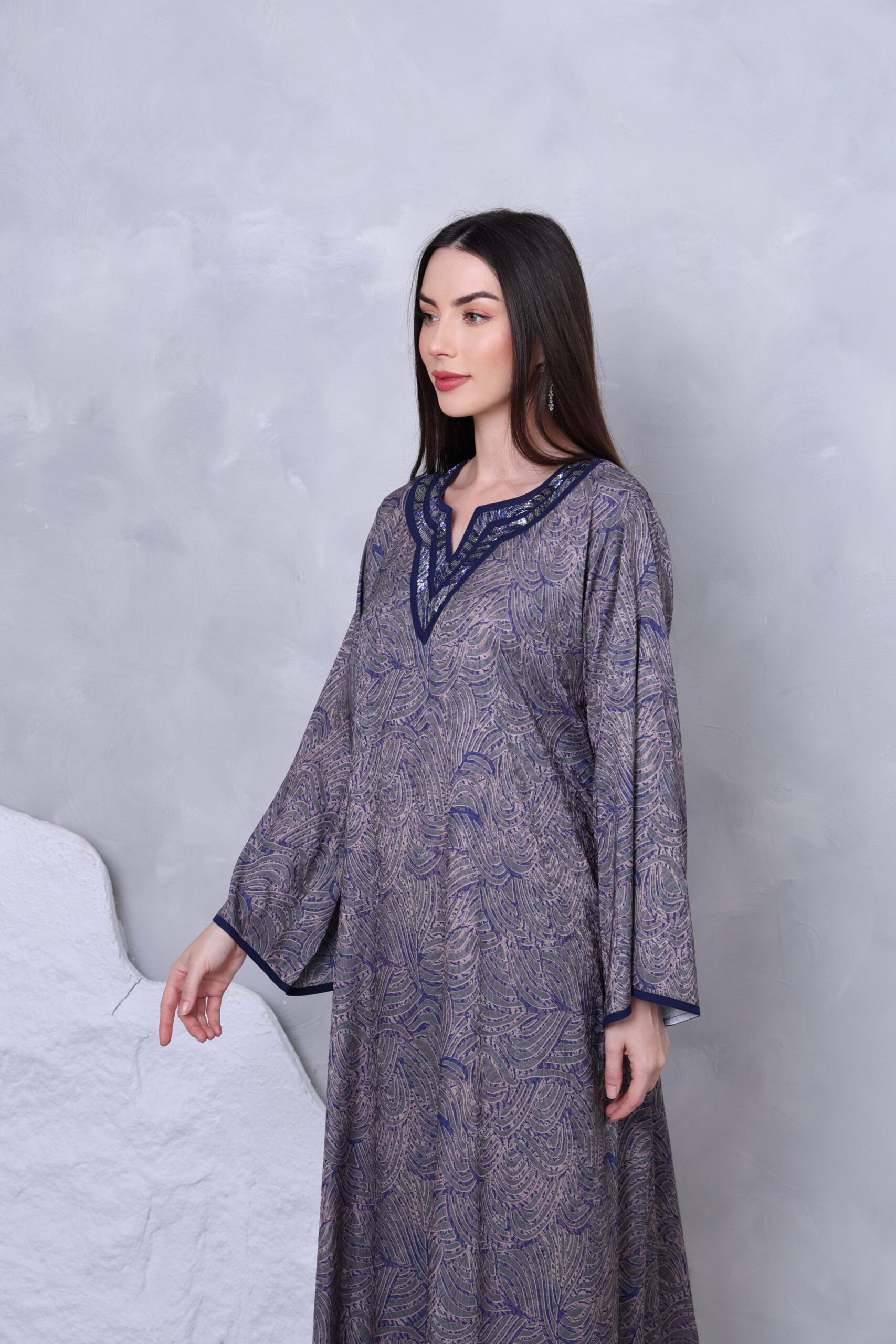 فستان حرير بقصة انسيابية، مزين بشغل شك يدوي أنيق عند الصدر يضيف لمسة فخامة ورقي.
