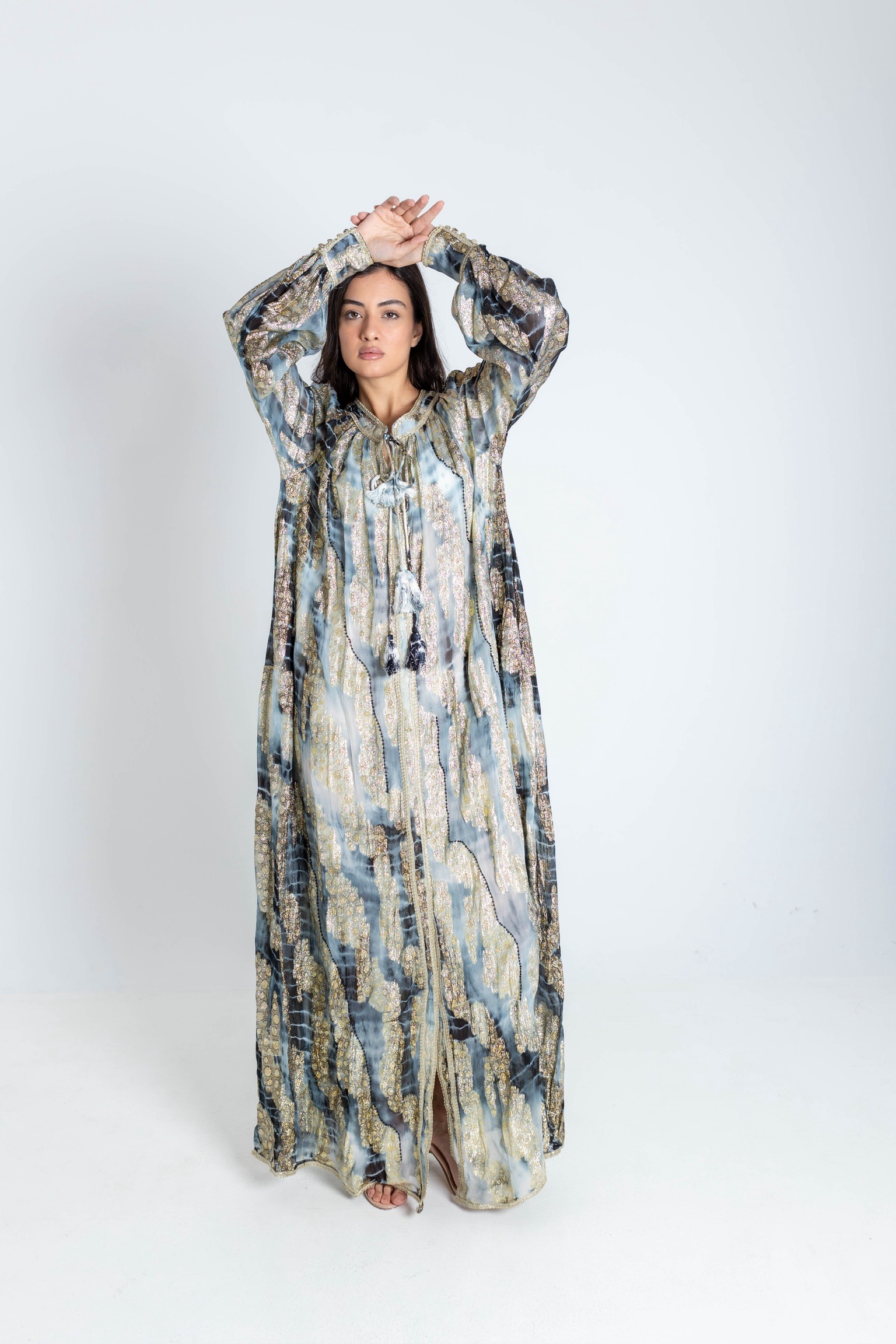 فستان شيفون مزري فاخر بتصميم انسيابي أنيق ولمسة فخمة تلفت الأنظار. يتميز بقماش شفاف بخفة عالية مع نقشة راقية ولمعات مزرية ناعمة تضيف إشراقة فاخرة للإطلالة. قصّة واسعة ومريحة مع فتحة رقبة أنثوية ورباط أمامي، وأكمام طويلة خفيفة تمنح حركة وانسيابية جميلة