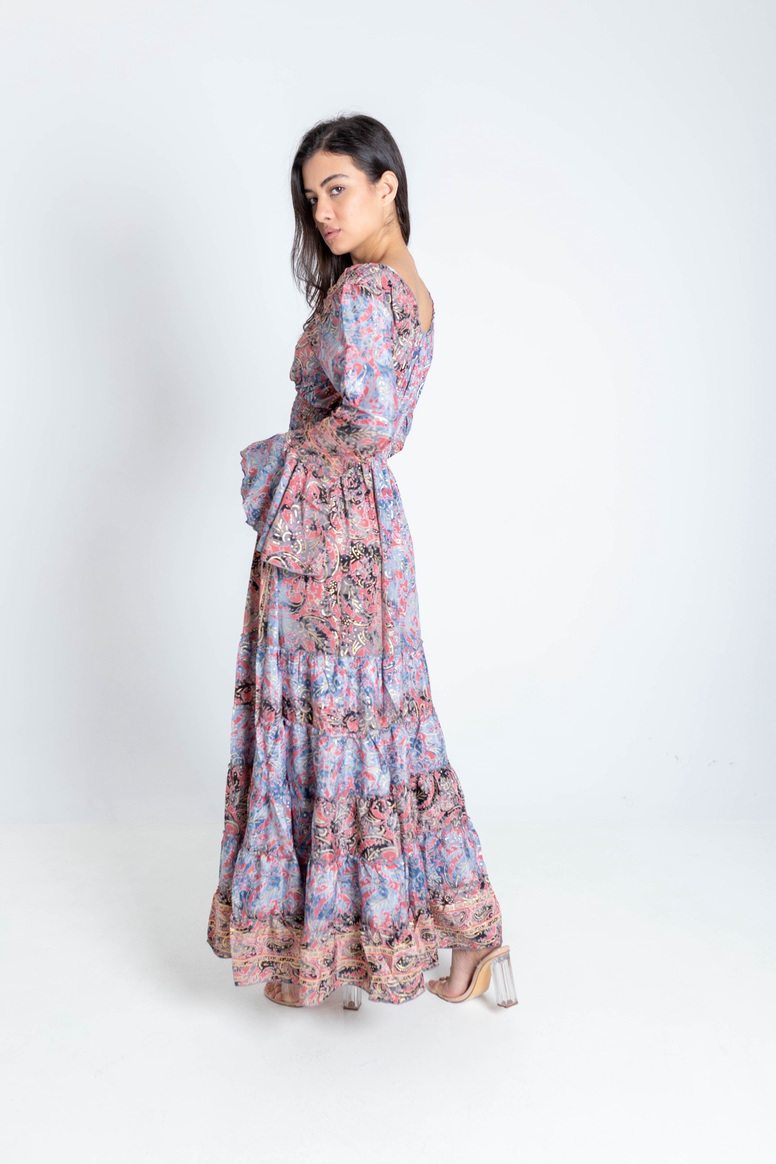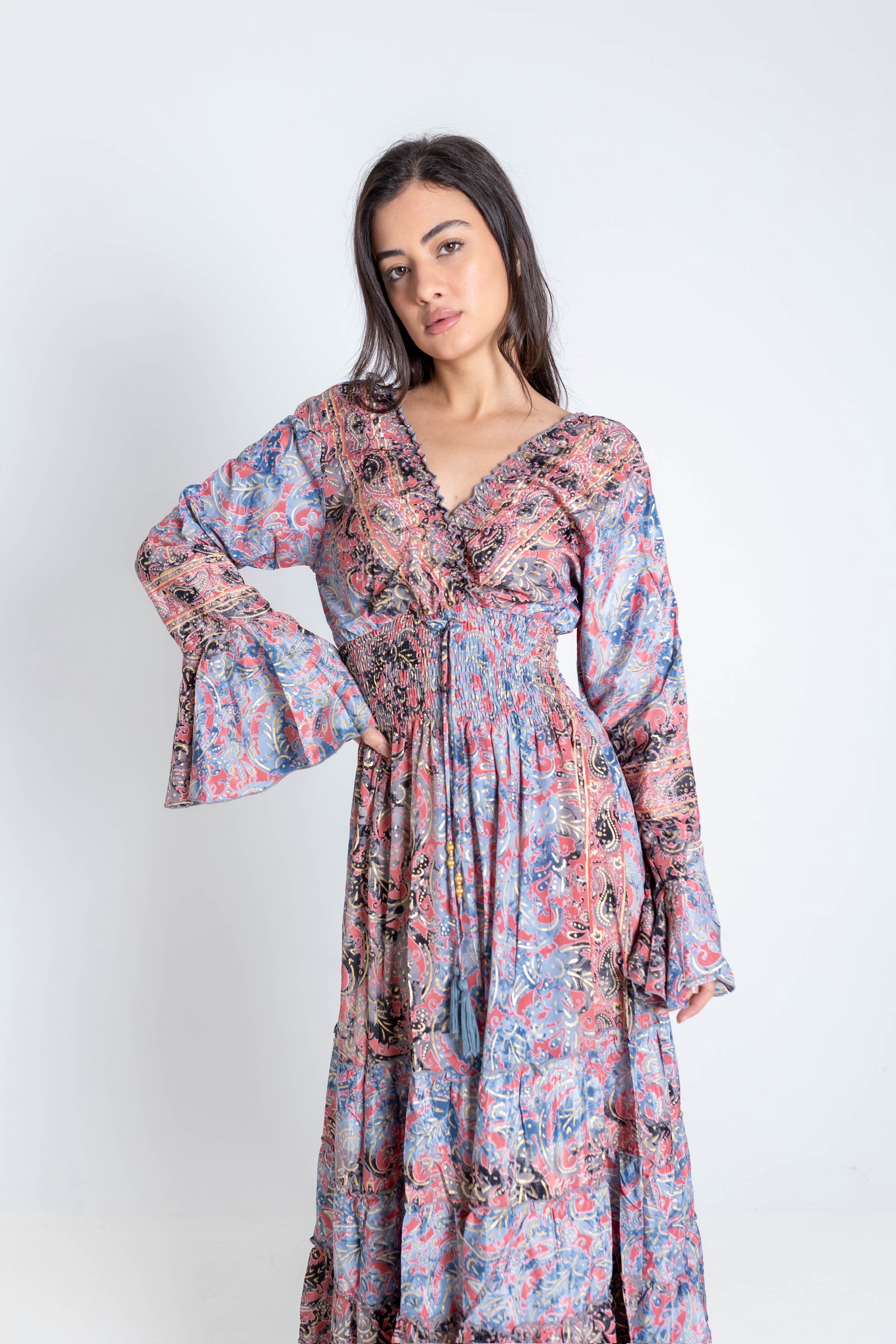 فستان من الحرير الإيطالي الفاخر بتصميم أنثوي أنيق ولمسة انسيابية راقية. يتميز بنقشة ناعمة وألوان مشرقة مع فتحة صدر جذابة وحزام مطاطي عند الخصر يبرز القوام بشكل جميل